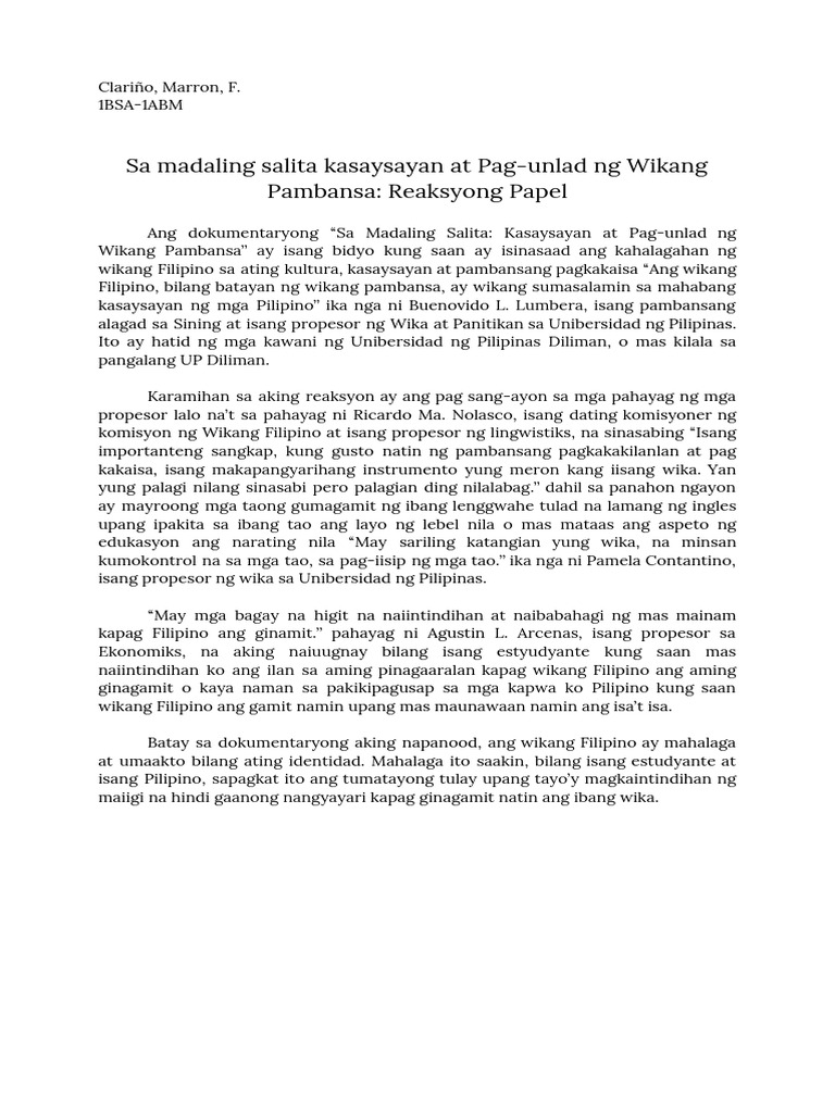 Sa Madaling Salita Docx Sa Madaling Salita Kasaysayan At Pag Unlad Ng Wikang Pambansa Ang Dokumentaryo Ay Tumatalay Tungkol Sa Napapanahong Course Hero