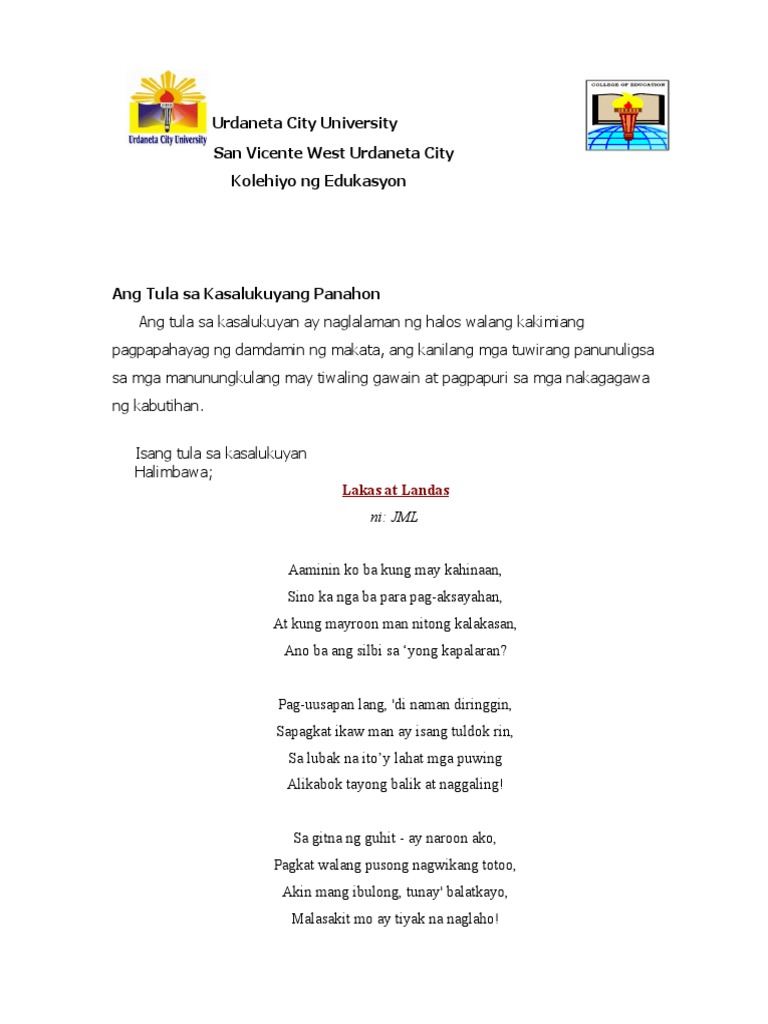 Ang Tula o poem sa ingles ay isang uri sining o panitikan na kilala dahil sa malayang paggamit ng wika sa ibat ibang anyo at estilo. ANG ASYA ANG LUNDUYAN NG MGA SINAUNANG KABIHASNAN. Uri ng tula na naglalarawan sa tunay na buhay ng mga magsasaka at sa bukid.