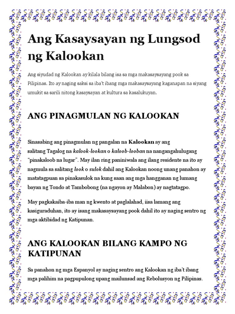 Unang tinawag na bayan ng Tambobong binuo ang Malabon bilang Visita. Sinasabing ang pinagmulan ng pangalan na Kalookan ay ang salitang Tagalog na kalook-lookan o kaloob-looban na nangangahulugang pinakaloob na lugar. Kasaysayan ng Sanaysay Mula pa noong panahong sinauna ang unang lumabas at siyang pinag-ugatan ng sanaysay ay ang ETHICS na isinulat ni Aristotle at CHARACTERS ni Theoprastus.