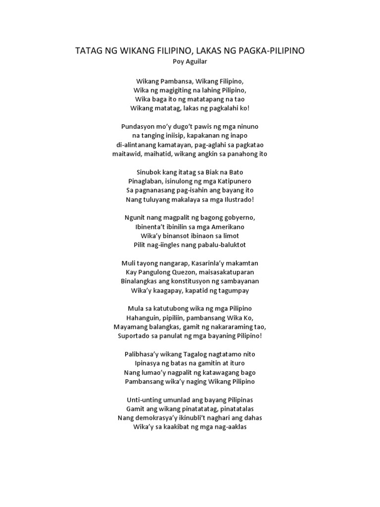 Mula raw ako sa mga kalapit-bayan ng aking bansa Na pinaniniwalang pinag-isa dahil sa kanilang pandarayuhan Kung kaya wangis koy katulad ng sa iilan. Saan mang dako mapadpad ang Pilipino bawat isa ay babangon at muling itatayo ang banderang minsay niyurakan ng mga dayuhang walang pakundangan.